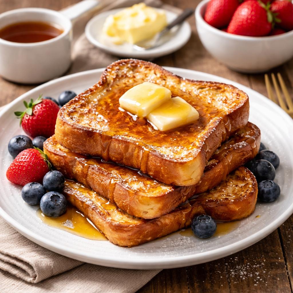 3. Ломтики хлеба окуните в молочную смесь полностью и затем обжарьте с обеих сторон до золотистой корочки. Подавайте тосты горячими с кусочком сливочного масла, полив кленовым сиропом.