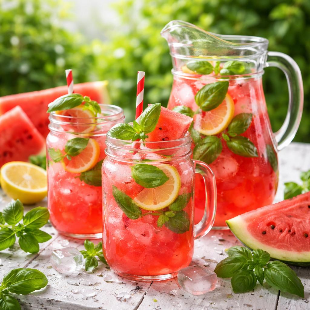4. Охладите лимонад и подавайте его в больших прозрачных стаканах со льдом, украсив свежим базиликом или, по желанию, небольшими дольками арбуза.
