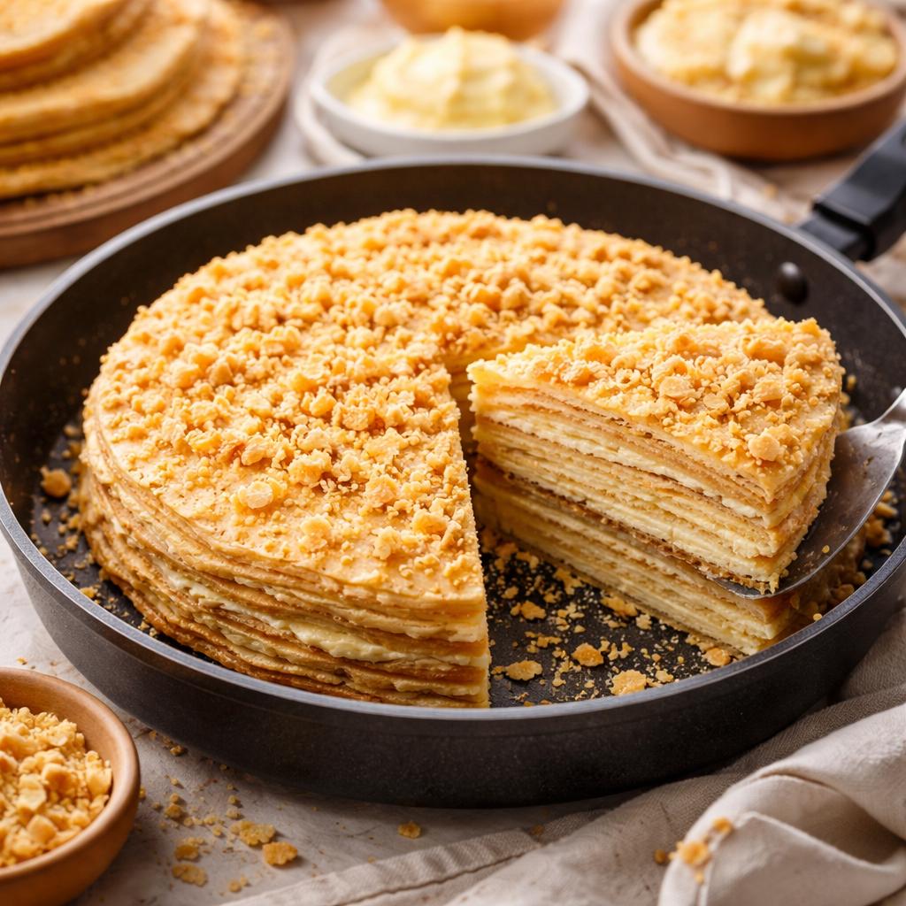 Рецепт обычного наполеона, в котором тонкие песочные коржи обильно пропитаны заварным кремом.